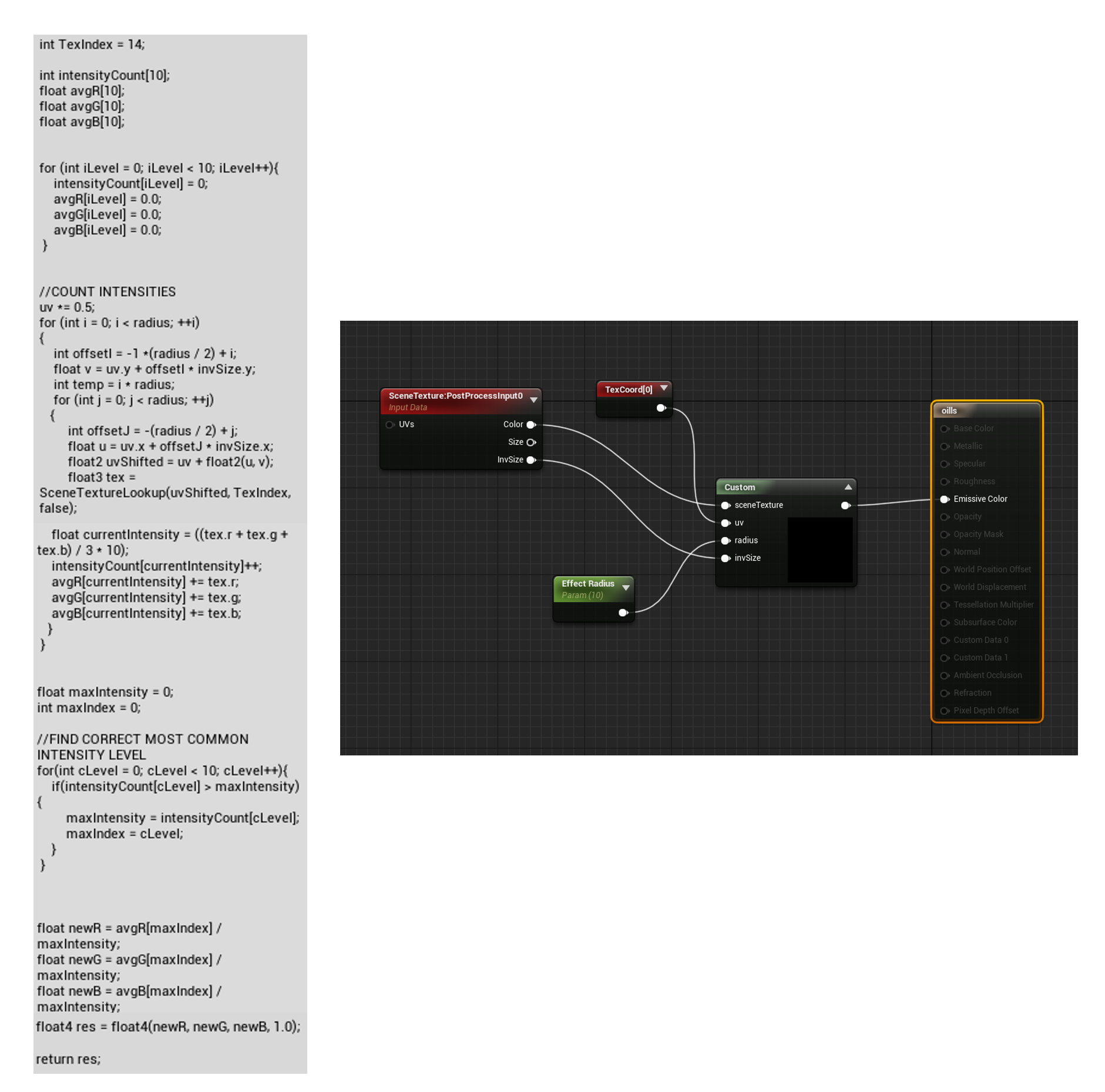Post processing effect created by FerkiZue (https://ferkizue.blogspot.com/2018/04/oil-painting-post-process-effect-in.html), used in Unreal Engine. Used to create a oil painting style effect to the image.