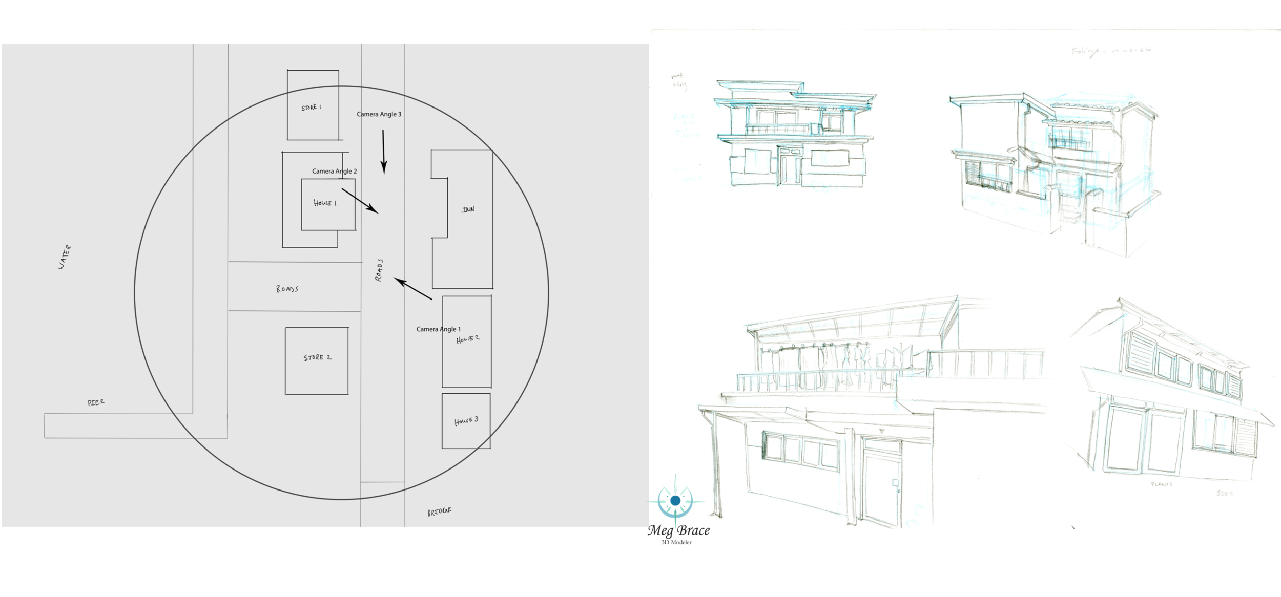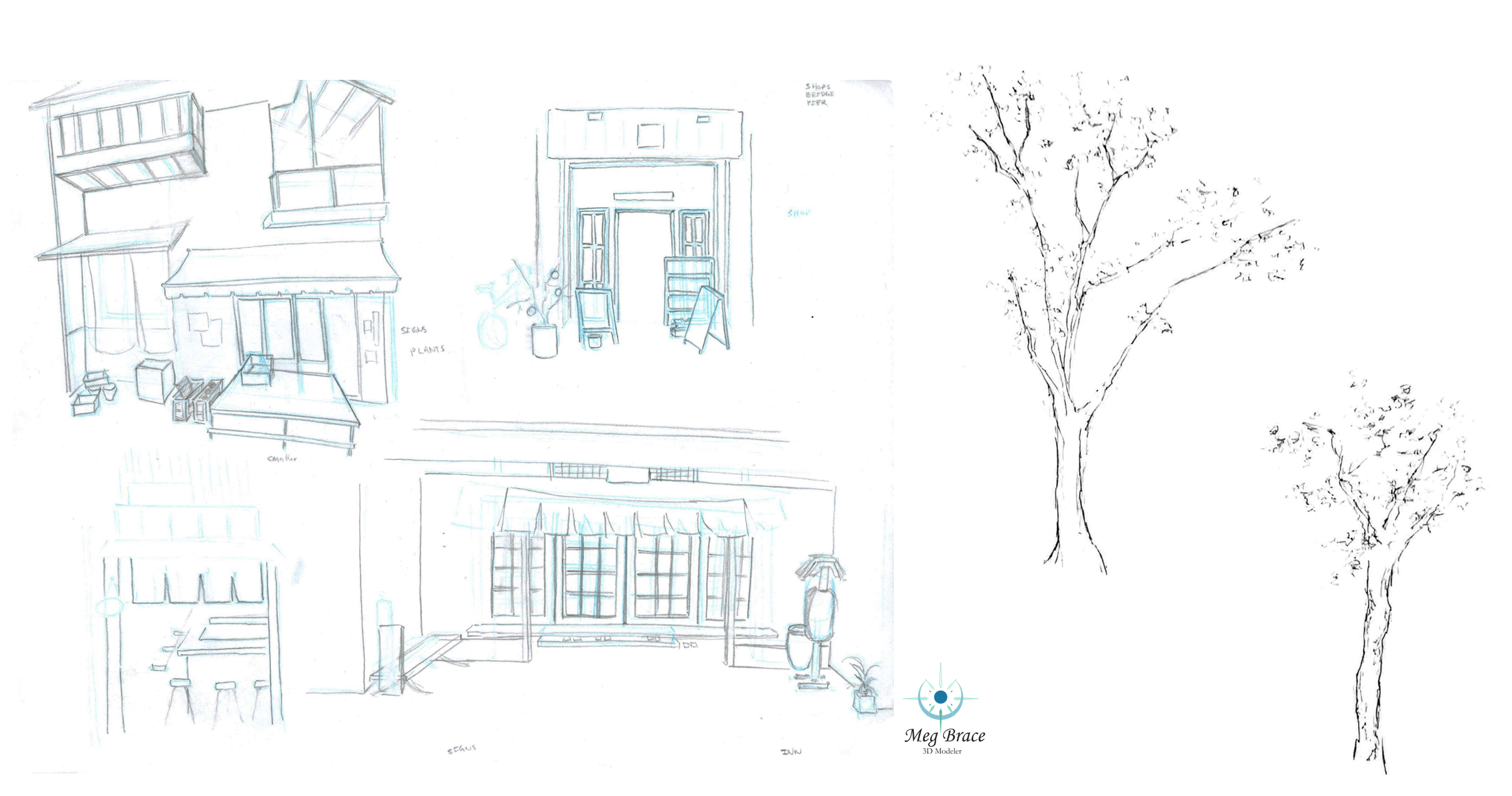 Sketches I created of the buildings to get a better understanding of the architecture and a sketch of some of the foliage.